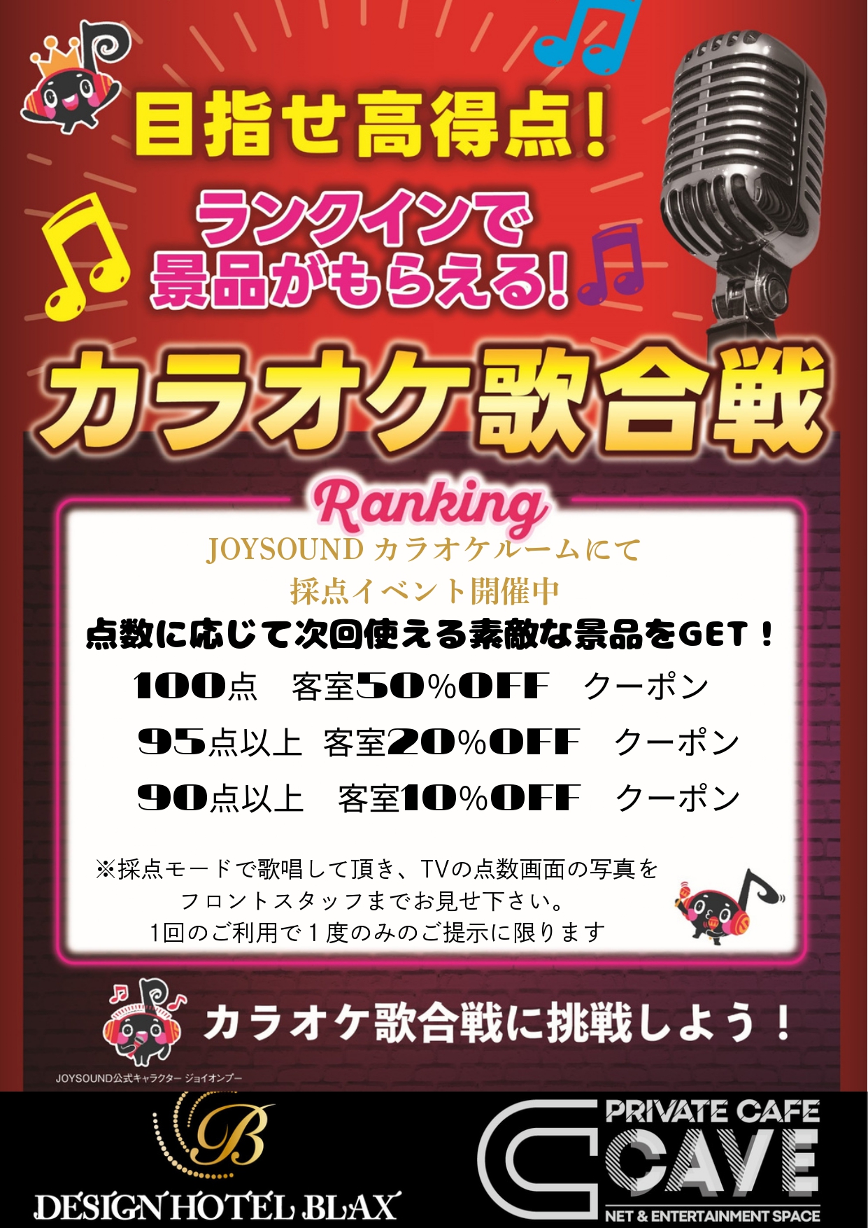 DESIGN HOTEL BLAX および PRIVATE CAFE CAVEでは、JOYSOUNDカラオケルームにて、**「カラオケ歌合戦」**イベントを開催中です!